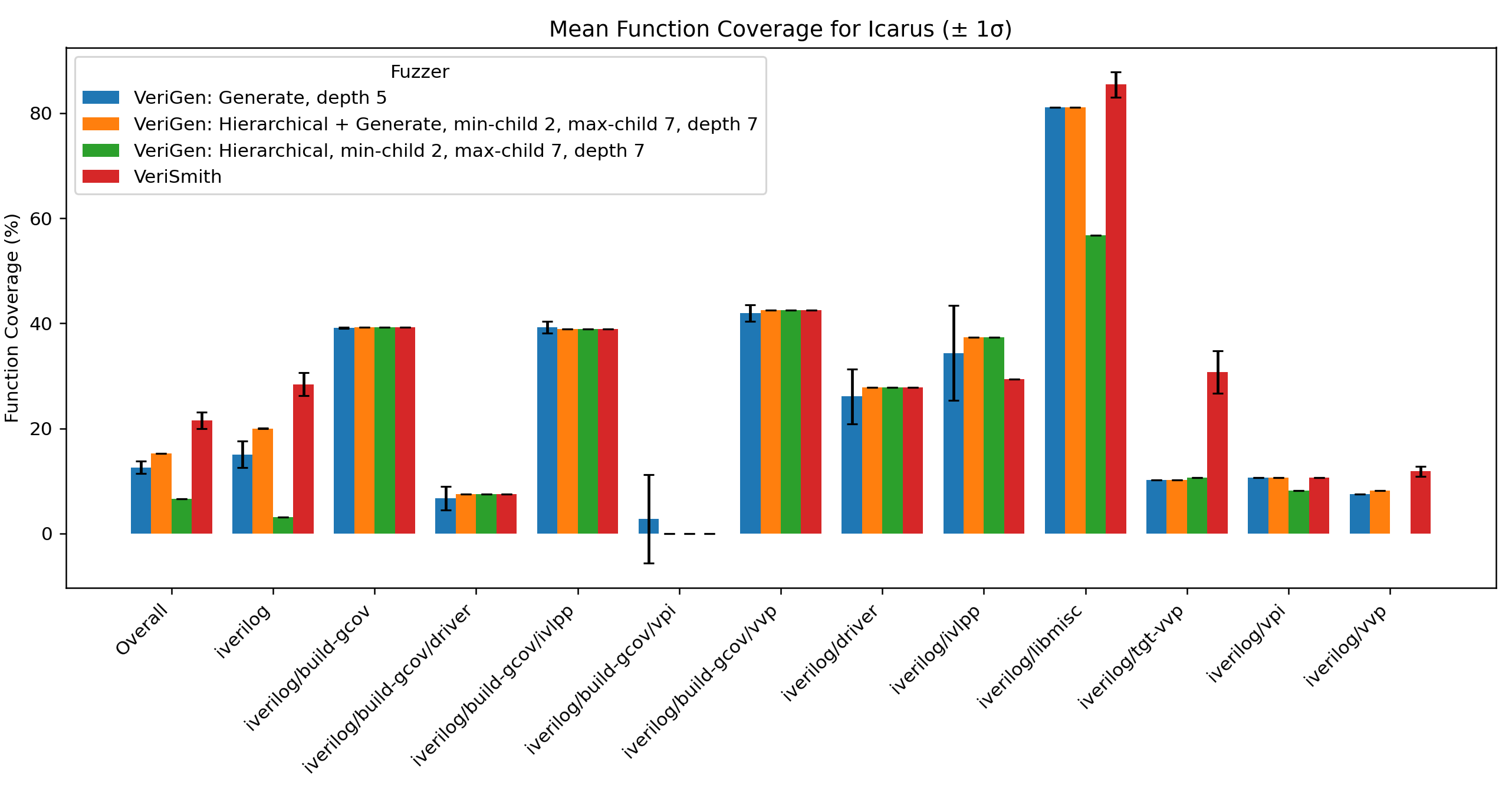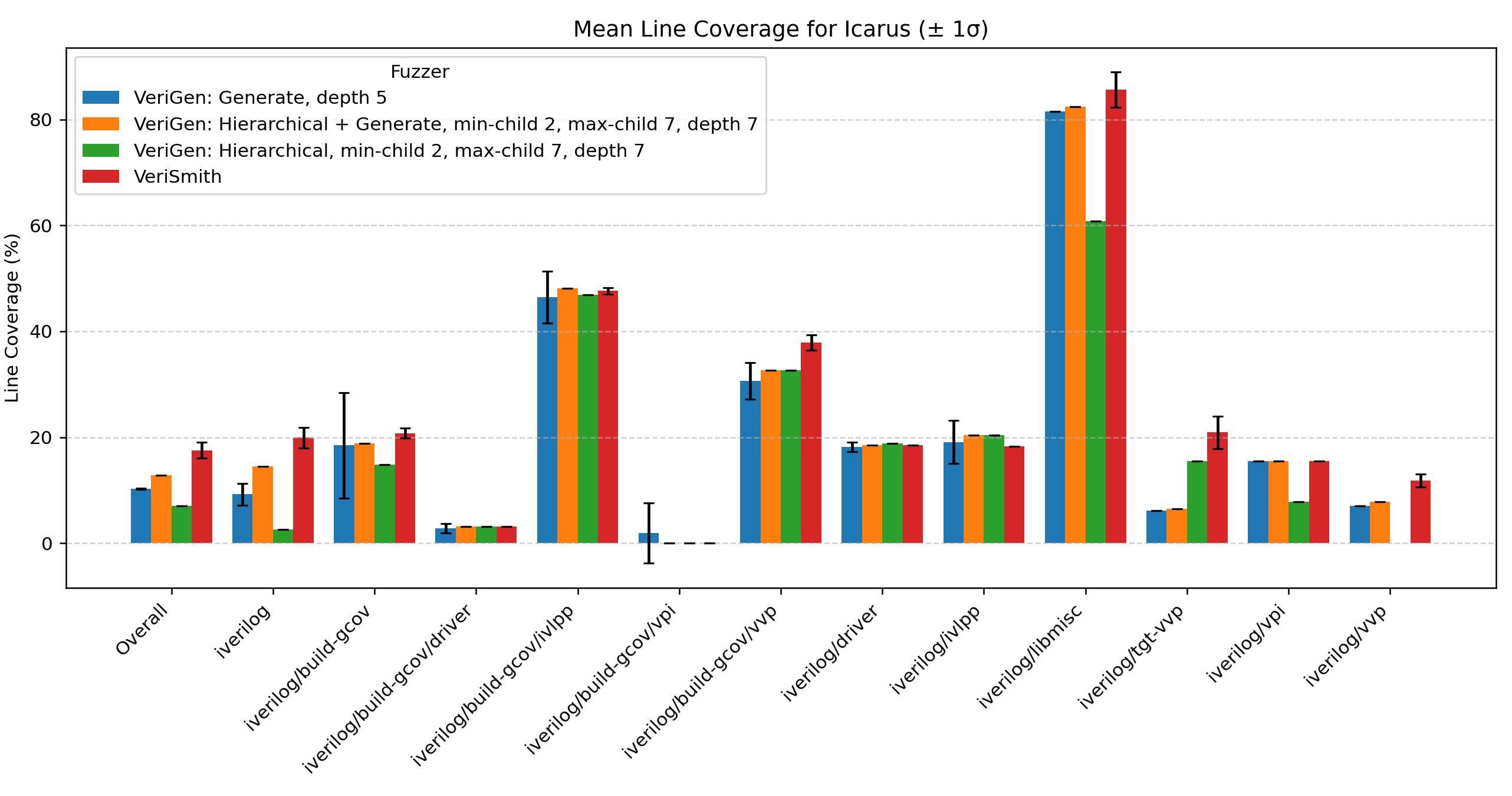 On coverage, the generator—despite being much smaller than VeriSmith—already reaches comparable regions of Icarus’s codebase. The generate-only and hierarchy-only modes land within 1–2% of each other, hinting that each explores distinct parts of the front-end. Combining both gives the best overall result and comes closest to VeriSmith. Icarus was rebuilt with coverage to obtain these measurements.